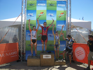 Placing got a little confusing as we worked our way through the juniors and the singlespeed machines, so I couldn't actually tell who was my immediate competition easily. I treated all women as competition, but did work with one singlespeed gal as the wind was particularly energy zapping on the final climb out to the finish. She would pull me up the climbs and I would pull her along the flats. Nice strategy as it got me closer to one of my competitors. I was climbing slightly better than her, but decided not to pull past her right then. I did something I rarely get a chance to do, and that is play tactics. I just waited, and sat on her wheel through the final singletrack that led back onto the race track to the finish. When we hit the pavement she did her best to get me to off her wheel by zig zagging across the track. I stayed with my plan, knowing she was using all her energy cutting through the head wind on the track. Just as soon as I saw the finish line I sprinted as hard as I could, leaving her standing. It was so sweet, I almost want to do a road race again!